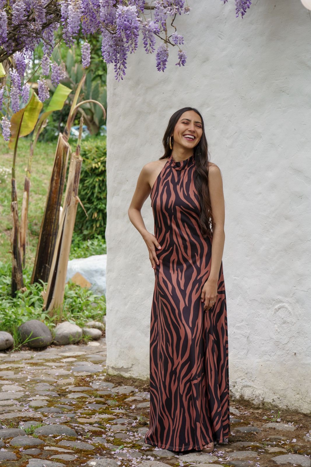 Cuenta con broches en el cuello que permiten un ajuste seguro y delicado, y una espalda descubierta que realza la silueta con un toque sofisticado. Su caída ligera aporta movimiento y elegancia natural en cada paso.
